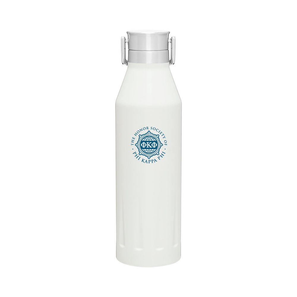 This 20.9 oz double-wall stainless steel thermal bottle features copper vacuum insulation, a threaded insulated lid, a carrying handle with silicone matching accent, and a stainless steel rim. Hand washing is recommended and should not be microwaved.